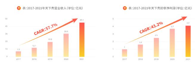 4月19日,天下秀交出了答卷。据财报显示,2021年,公司实现营业收入45.1亿元,同比增长47.4%;扣非净利润4.2亿元,同比增长12.7%。
