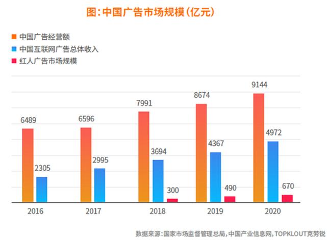 2021年,中国网民来到十亿规模,流量红利俨然见顶。根据QuestMobile数据显示,2021年互联网广告市场规模达6,550.2亿元,同比增速仅16.9%。而红人营销作为互联网广告的子行业,红人们能靠着粉丝粘性,引导粉丝进行消费,提升品牌形象和知名度,具有互动性强、投放费用低、方式灵活、变现能力强等特点。