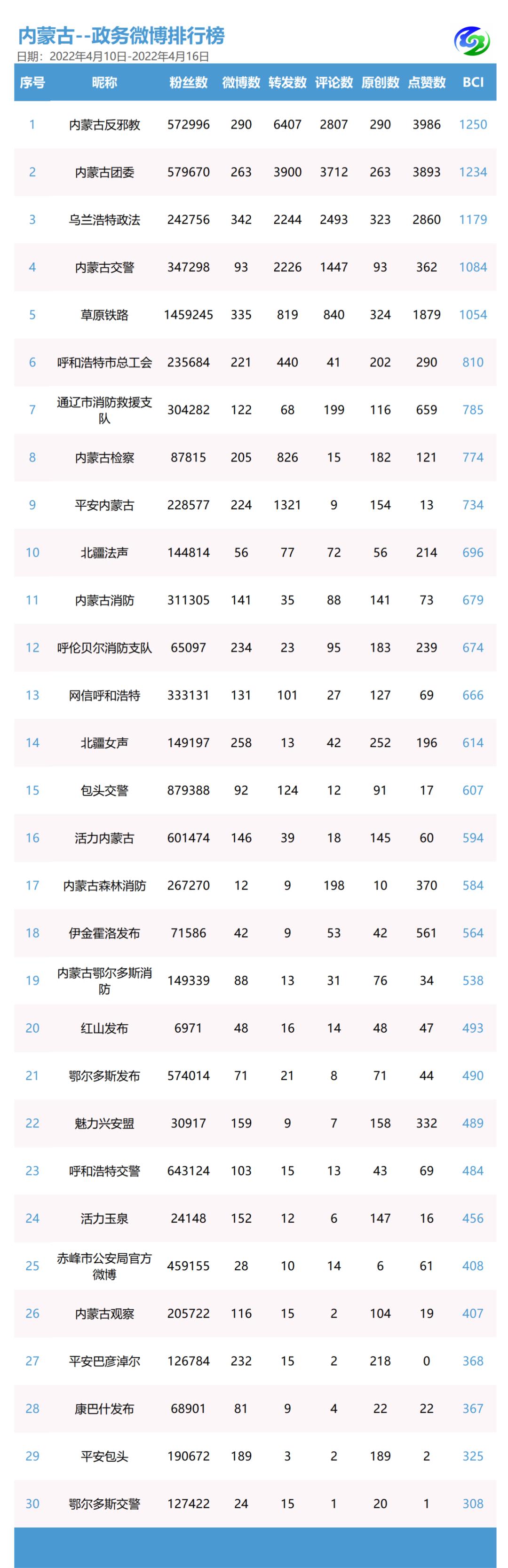 4月10日-4月16日内蒙古微博排行榜政务榜单