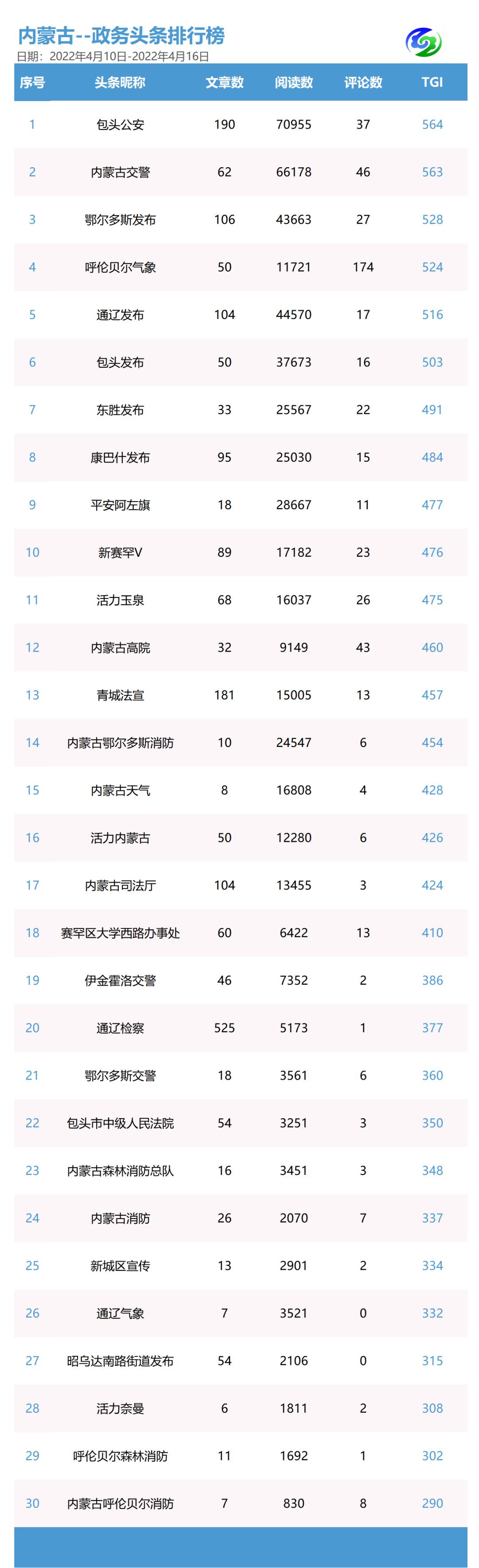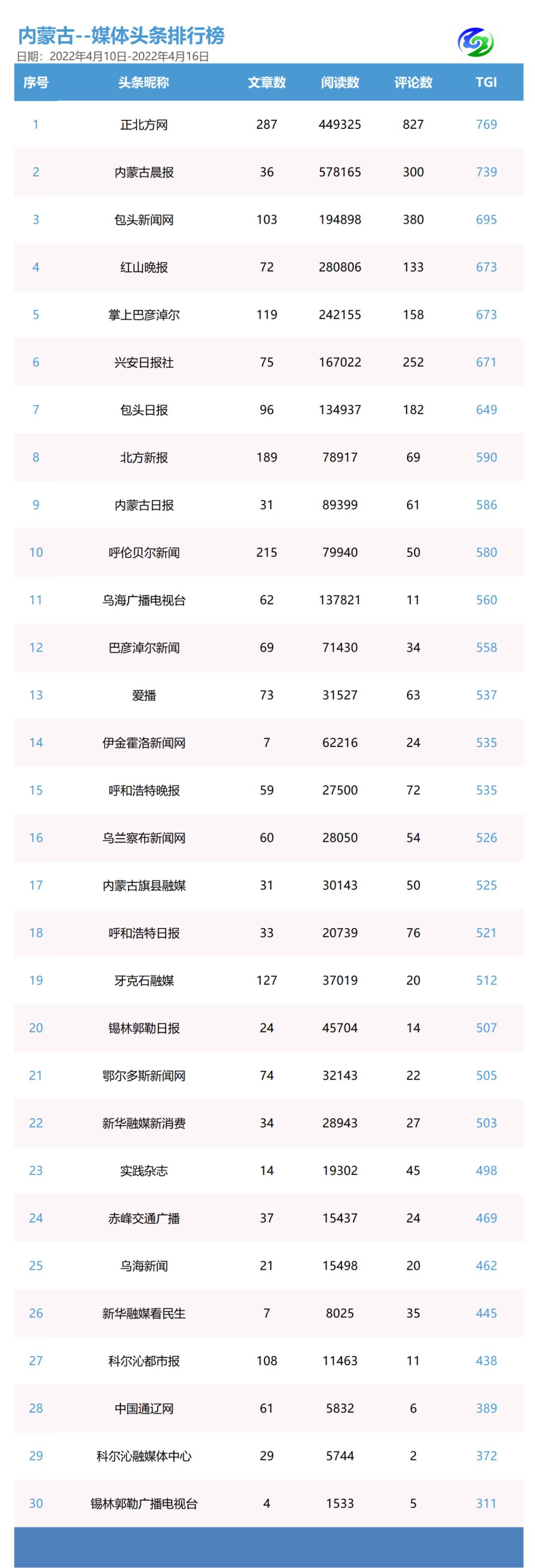 原标题:《4月10日-4月16日内蒙古新媒体影响力排行榜》