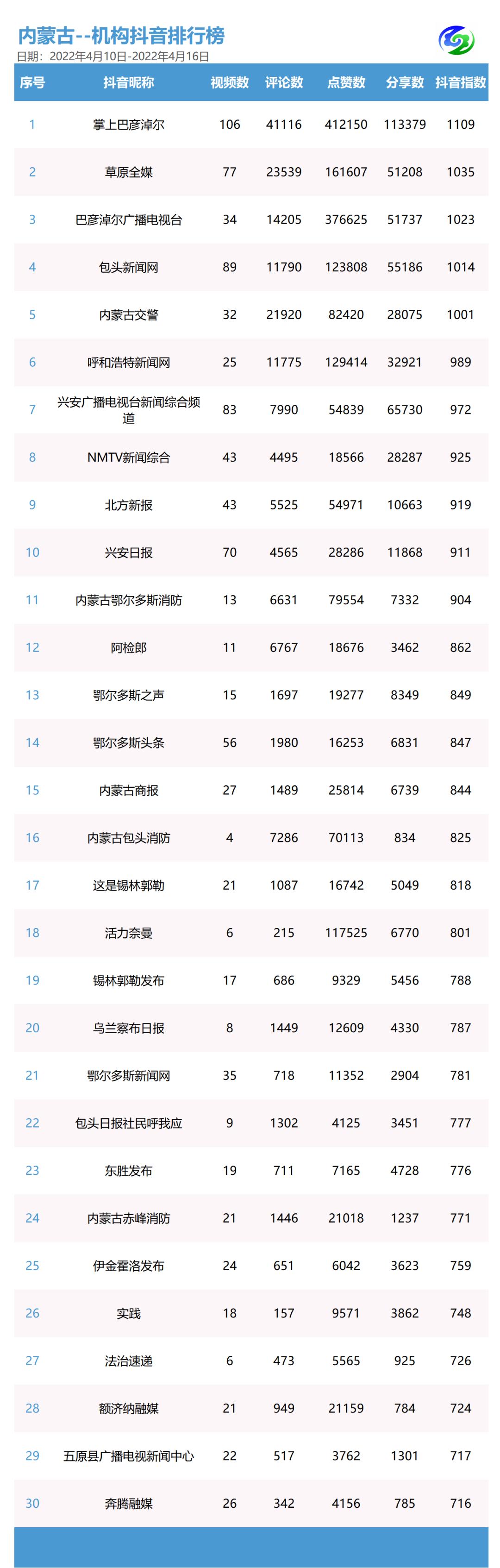 4月10日-4月16日内蒙古抖音排行榜机构榜单