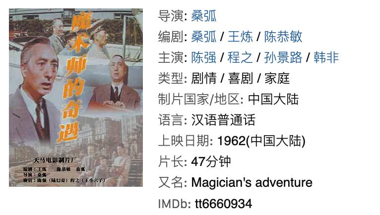 【推荐理由】举贤不避亲。父亲桑弧执导的新中国第一部彩色宽银幕立体电影《魔术师的奇遇》,在东湖立体影院连映四年轰动全城。时过境迁,这部影片实拍的外景画面,无形中保留了60年前上海著名景观,如外滩、人民大道、北站、西郊公园等等的影像,如今已成为怀旧性看点。播放平台