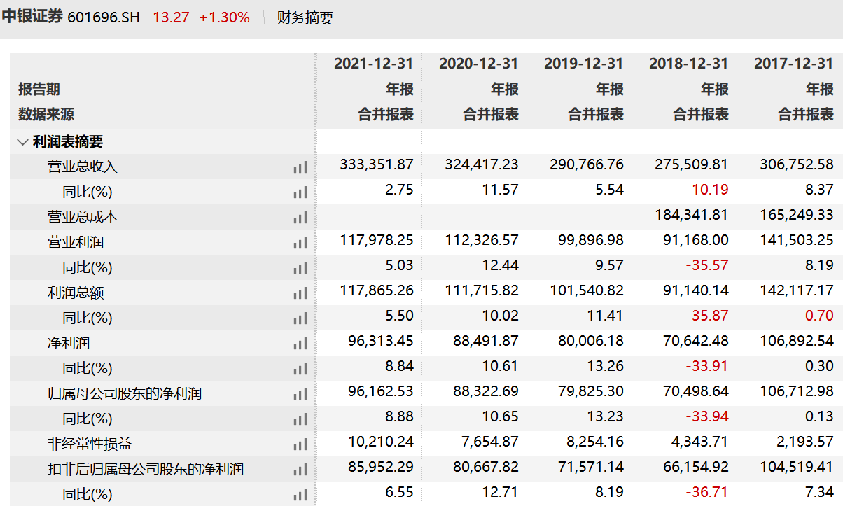 2021年年报显示,中银证券在2021年实现营业收入33.34亿元,同比(较上年同期)增长2.75%;实现归属于上市公司股东的净利润9.62亿元,同比增长8.88%。