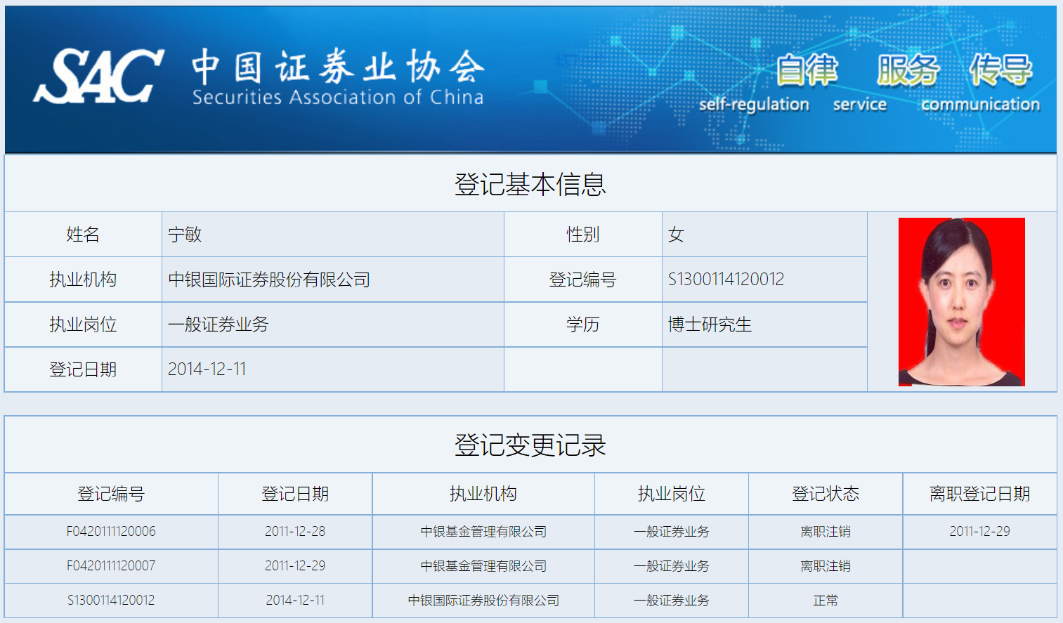 中国证券业协会信息显示,宁敏曾在中银基金注册登记,执业岗位为一般证券业务。