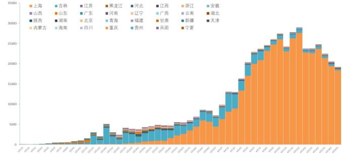 昨日全国本土净新增2753+17066-616=19203例,全国净新增比前一日减少1266例,其中上海比前一日减少1074,吉林比前一日减少120,详见图1、表2。