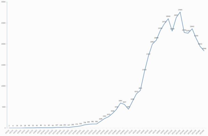截至4月19日24时,据31个省(自治区、直辖市)和新疆生产建设兵团报告,现有确诊病例30773例(其中重症病例116例),累计治愈出院病例155684例,累计死亡病例4655例,累计报告确诊病例191112例,现有疑似病例6例。累计追踪到密切接触者2937350人,尚在医学观察的密切接触者412624人。