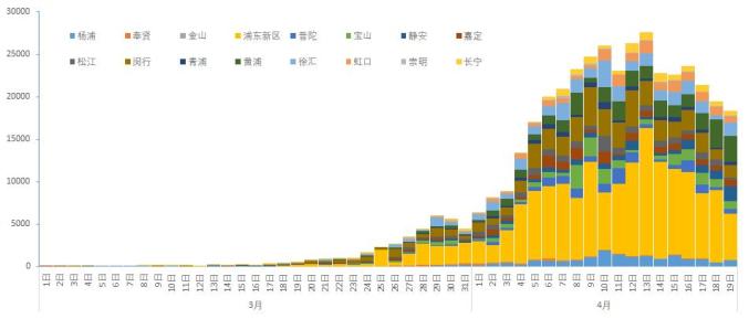 上海目前已经进入波动下降阶段,近两日新增病例数下降明显,昨日新增病例比18日下降1074例,新增病例数在2万以上连续运行11天后连续2天下降到万以下,近期新增病例数可能还会出现大幅度下降。昨日新增2494例新冠肺炎本土确诊病例和16407例本土无症状感染者。2494例本土确诊病例中,1800例在闭环隔离管控中发现,161例在相关风险人群核酸筛查中发现,533例为无症状感染者转归确诊病例。16407例本土无症状感染者中,16178例在闭环隔离管控中发现,229例在相关风险人群核酸筛查中发现。浦东新区持续下降,昨日新增降低到5000左右,静安、徐汇出现一定程度增长。