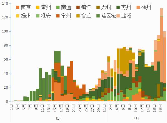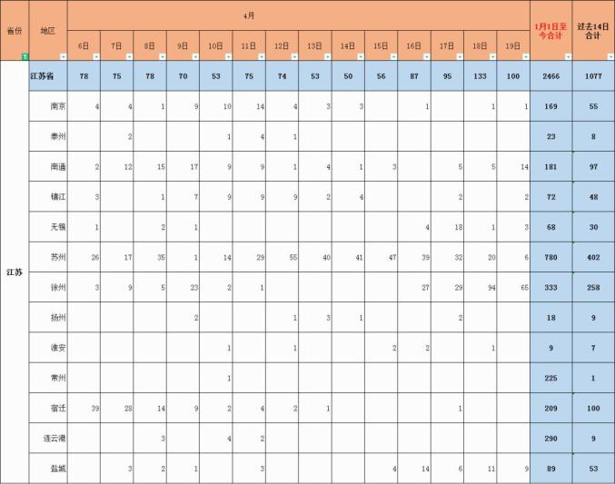 3、江苏:4月19日0-24时,江苏新增本土确诊病例8例(无锡市1例,由无症状感染者转为确诊病例;徐州市5例,其中1例由无症状感染者转为确诊病例;苏州市1例;宿迁市1例,由无症状感染者转为确诊病例。均在定点医院隔离治疗),新增本土无症状感染者95例(南京市1例,无锡市3例,徐州市61例,苏州市5例,南通市14例,盐城市9例,镇江市2例,均在定点医院接受隔离医学观察)。新增境外输入无症状感染者1例。新增出院病例7例(本土6例,境外输入1例),解除隔离医学观察的无症状感染者63例(本土58例,境外输入5例)。新增确诊病例、无症状感染者详情由相关设区市发布。目前,在定点医院隔离治疗的确诊病例90例(本土88例,境外输入2例),接受隔离医学观察的无症状感染者948例(本土939例,境外输入9例)。2020年1月22日至今,全省累计报告新冠肺炎确诊病例2148例(其中境外输入223例)。江苏省疫情研判
