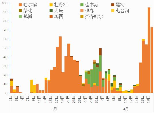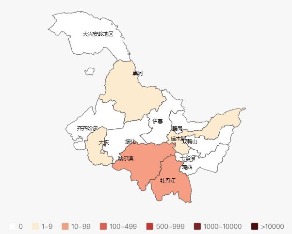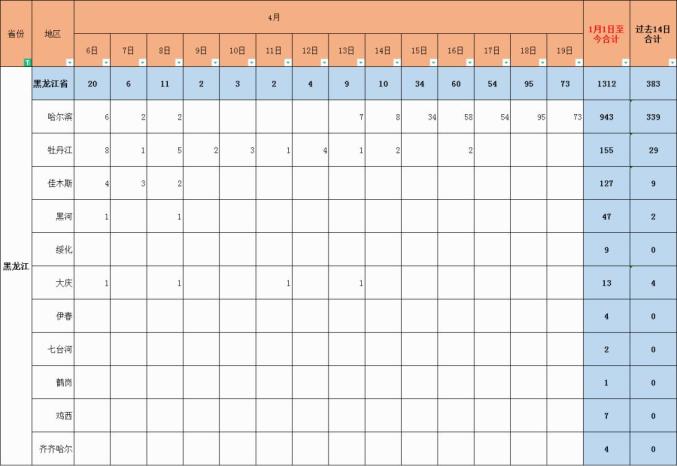 4、黑龙江省:2022年4月19日0-24时,黑龙江省新增新冠肺炎本土确诊病例45例(均在哈尔滨市),新增本土无症状感染者28例(均在哈尔滨市),均为隔离管控期间核酸检测发现或对重点人群主动排查发现。当日解除医学观察本土无症状感染者12例(佳木斯市8例,伊春市2例,黑河市1例,大庆市1例)。截至4月19日24时,全省现有境外输入确诊病例1例,境外输入无症状感染者6例;全省现有本土确诊病例232例,本土无症状感染者149例。黑龙江省疫情研判