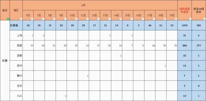 6、江西省:2022年4月19日0-24时,江西省新增本土确诊病例25例(均在南昌市;临床分型为普通型1例、轻型24例);新增治愈出院2例(其中南昌市1例、吉安市1例)。从2020年1月至2022年4月19日24时,全省累计报告本土确诊病例1104例,累计出院病例1061例,累计死亡病例1例。截至2022年4月19日24时,全省现有本土住院确诊病例42例。2022年4月19日0-24时,江西省无新增境外输入确诊病例报告。从2020年1月至2022年4月19日24时,全省累计报告境外输入确诊病例及关联病例11例,累计出院病例11例,无住院境外输入确诊病例。2022年4月19日0-24时,江西省新增本土无症状感染者28例(均在南昌市);解除医学隔离观察23例(其中南昌市20例、宜春市1例、吉安市1例、上饶市1例)。截至2022年4月19日24时,全省现有本土无症状感染者132例,均在定点医疗机构接受隔离医学观察。