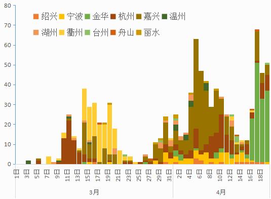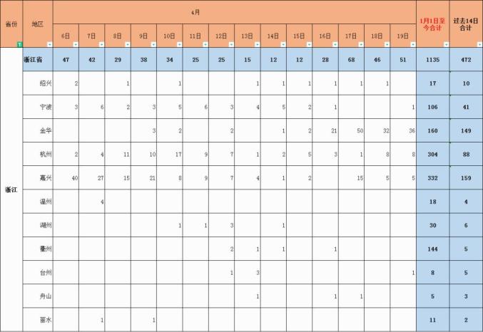 7、浙江省:4月19日0-24时,11个市报告新增确诊病例8例。其中无境外输入病例;本土病例8例(杭州市5例,宁波市1例,嘉兴市2例),含4例由无症状感染者转为确诊病例(杭州市3例,嘉兴市1例)。当日新增治愈出院病例15例,解除医学观察的密切接触者1022人。11个市报告新增无症状感染者47例。其中无境外输入无症状感染者;本土47例(杭州市6例,嘉兴市4例,金华市36例,台州市1例)。截至19日24时,全省累计报告确诊病例2941例。其中境外输入病例590例;本土病例2351例。浙江省疫情研判