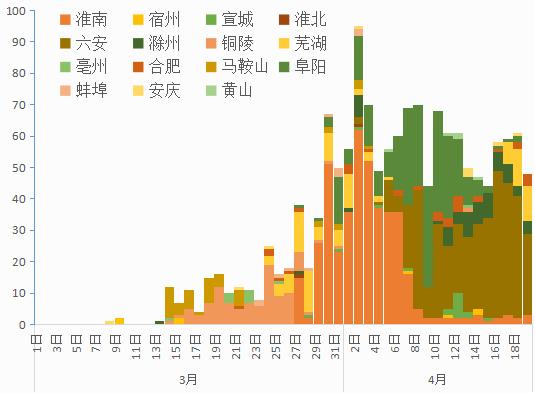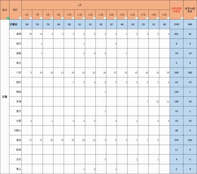 8、安徽省:2022年4月19日0-24时,安徽省报告无新增确诊病例,无新增疑似病例,新增无症状感染者48例(合肥市蜀山区4例,淮南市田家庵区3例,滁州市天长市4例,六安市霍邱县5例、裕安区21例,芜湖市镜湖区6例、弋江区3例、鸠江区2例),新增解除医学观察的无症状感染者50例(阜阳市颍上县8例、颍州区17例、颍东区1例,淮南市凤台县7例,六安市裕安区16例,芜湖市繁昌区1例)。截至4月19日24时,安徽省累计报告本地确诊病例1045例,目前在院治疗10例(合肥市肥东县1例、蜀山区1例,淮南市凤台县3例,宣城市宣州区1例,阜阳市颍州区1例,滁州市明光市2例,六安市霍邱县1例),累计治愈出院1029例;累计报告境外输入确诊病例15例,治愈出院15例;累计报告医学观察85612人,尚在医学观察的密切接触者23885人。