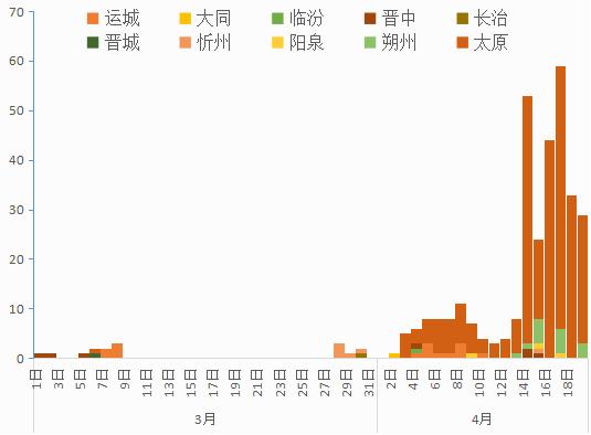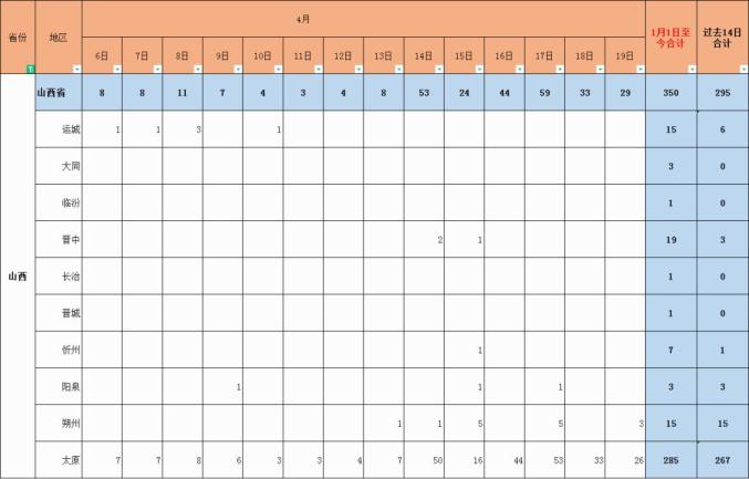9、山西省:4月18日0-24时,山西省新增本土确诊5例(太原市小店区1例,太原市清徐县4例),新增治愈出院10例(太原市小店区10例);累计报告确诊257例治愈出院201例,现有在院隔离治疗56例(太原市小店区10例、太原市万柏林区4例、太原市晋源区1例、太原市清徐县26例、阳泉市郊区1例、朔州市应县10例、晋中市榆次区2例、运城市临猗县1例、忻州市繁峙县1例),现有疑似0例。无新增境外输入确诊,新增治愈出院1例;累计报告确诊137例全部治愈出院,现有疑似0例。新增无症状感染者28例(太原市迎泽区1例、清徐县27例),当日解除医学观察8例(太原市迎泽区2例、太原市万柏林区2例、太原市清徐县2例、境外输入2例),尚在医学观察的无症状感染者193例(太原市小店区10例、太原市迎泽区3例、太原市杏花岭区2例、太原市万柏林区6例、太原市晋源区1例、太原市清徐县162例、太原市阳曲县1例、阳泉市平定县2例、长治市黎城县1例、朔州市应县2例、晋中市太谷区1例、境外输入2例)。累计追踪到密接者16922人(含境外输入病例密接者)。当日解除医学观察634人,尚在医学观察的密接者3782人。