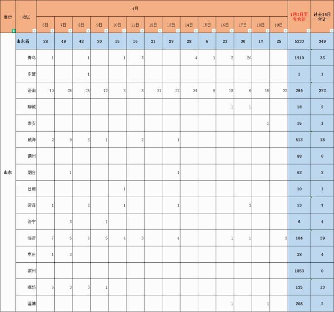 10、山东省:2022年4月18日0时至24时,全省报告新增本土确诊病例1例,在济南。新增本土无症状感染者16例,其中济南14例、淄博1例、泰安1例。无新增境外输入确诊病例。新增境外输入无症状感染者3例,其中济南1例,为韩国输入;青岛1例,为韩国输入;威海1例,为韩国输入。2022年4月18日0时至24时,全省报告本土无症状感染者转为确诊病例1例,在青岛。2022年4月18日0时至24时,全省本土确诊病例出院16例,其中滨州7例、济南6例、青岛2例、德州1例。本土无症状感染者解除医学观察66例,其中滨州53例、枣庄8例、济南3例、烟台1例、临沂1例。全省无境外输入确诊病例出院。无境外输入无症状感染者解除医学观察。截至2022年4月18日24时,全省现有本土确诊病例108例、本土无症状感染者734例。全省现有境外输入确诊病例7例、境外输入无症状感染者24例。