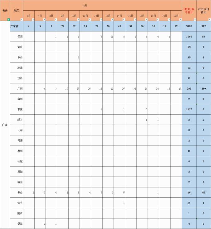 11、广东省:4月19日0-24时,全省新增本土确诊病例14例(其中3例为无症状感染者转确诊),均为广州报告;新增本土无症状感染者6例,均为广州报告。全省新增出院10例(境外输入5例),目前在院295例(境外输入26例);新增解除医学观察无症状感染者49例(境外输入35例),尚在医学观察无症状感染者423例(境外输入276例)。全省新增境外输入确诊病例1例,深圳报告,来自日本。新增境外输入无症状感染者32例,广州报告10例,6例来自斯里兰卡,2例来自泰国,其余2例分别来自新加坡和澳大利亚;深圳报告21例,19例来自中国香港,2例来自日本;佛山报告1例,来自孟加拉国。