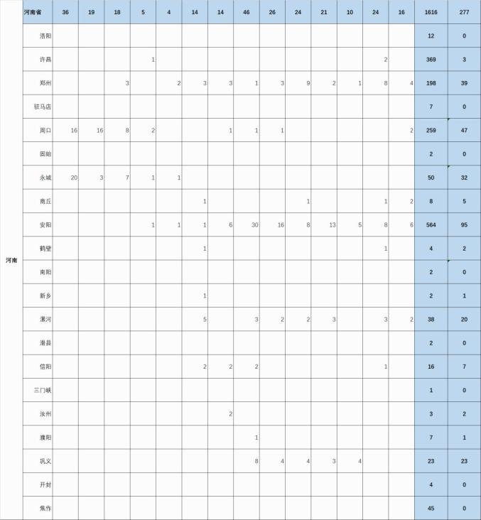 12、河南省:4月19日0—24时,河南省新增本土确诊病例3例(安阳市3例),新增本土无症状感染者13例(郑州市4例,安阳市3例,漯河市2例,商丘市2例,周口市2例)。新增境外输入无症状感染者4例,无新增境外输入确诊病例和疑似病例。17例本土无症状感染者解除医学观察。2020年1月21日至2022年4月19日24时,河南省累计报告确诊病例2862例(本土2652例、境外输入210例),现有住院病例23例(本土21例,境外输入2例),尚在医学观察的无症状感染者213例(本土206例,境外输入7例)。累计追踪到密切接触者81238人,正在观察的密切接触者7194人。河南省疫情研判