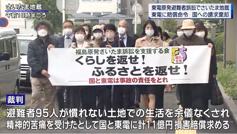 日本民众拉起写有“还我生活、还我故乡”的横幅赶赴埼玉地方法院。(日本琦玉电视台报道截图)