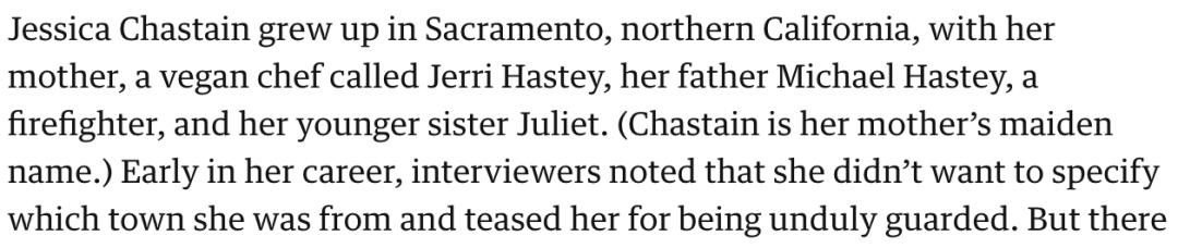 Jessica Chastain,1977年3月24日出生在美国加州的萨克拉门托。身处聚光灯下,她并没有很乐意提及自己的家庭,分享自己的隐私。