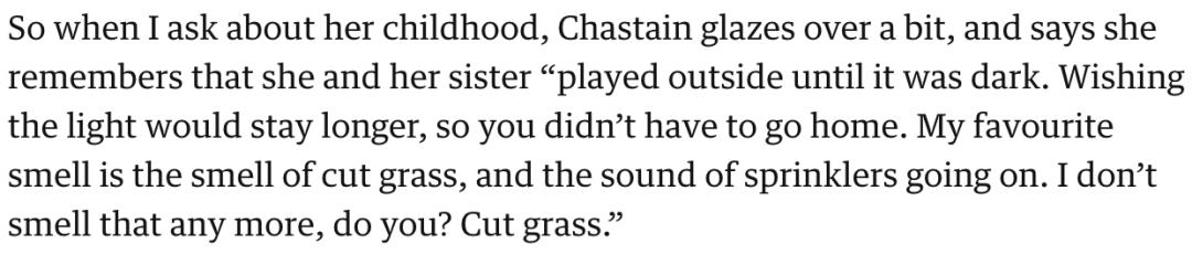 ▲ 在16年《卫报》的一篇报道里,她被问及童年时明显愣了一下,才缓缓道来。记忆里,她总是跟妹妹一起在外面玩,直到天黑,那时候会盼望着光可以就此停留,这样就不必回家。她最爱的气味是割草的味道,伴随着一旁洒水器运作的声音,只是好像再也没有闻到过^(或许是因为陪伴玩耍的妹妹已经不在人世)对于生活算不上富庶,甚至有一点困窘的孩子来说,信仰是件无比重要的事,像是生命里的那一束光,指引着前进的方向。