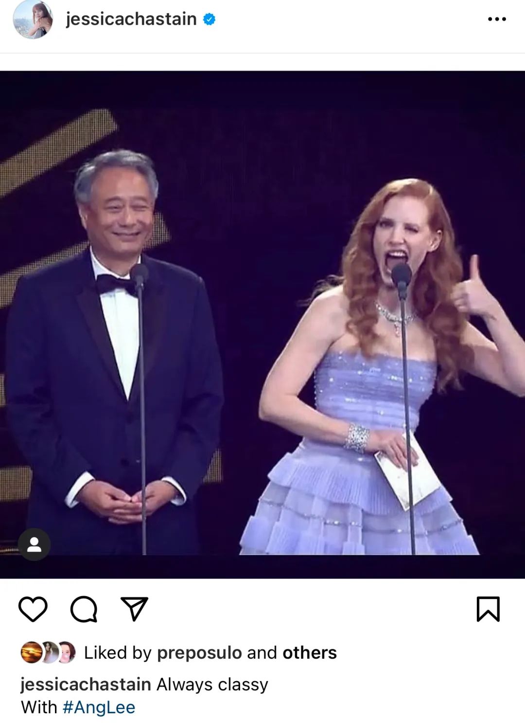 ▲ 2017年来到台湾出席金马奖,以下蹲姿势给当时获得最佳女主角的惠英红颁奖,事后不忘在ins放上跟李安的合照。