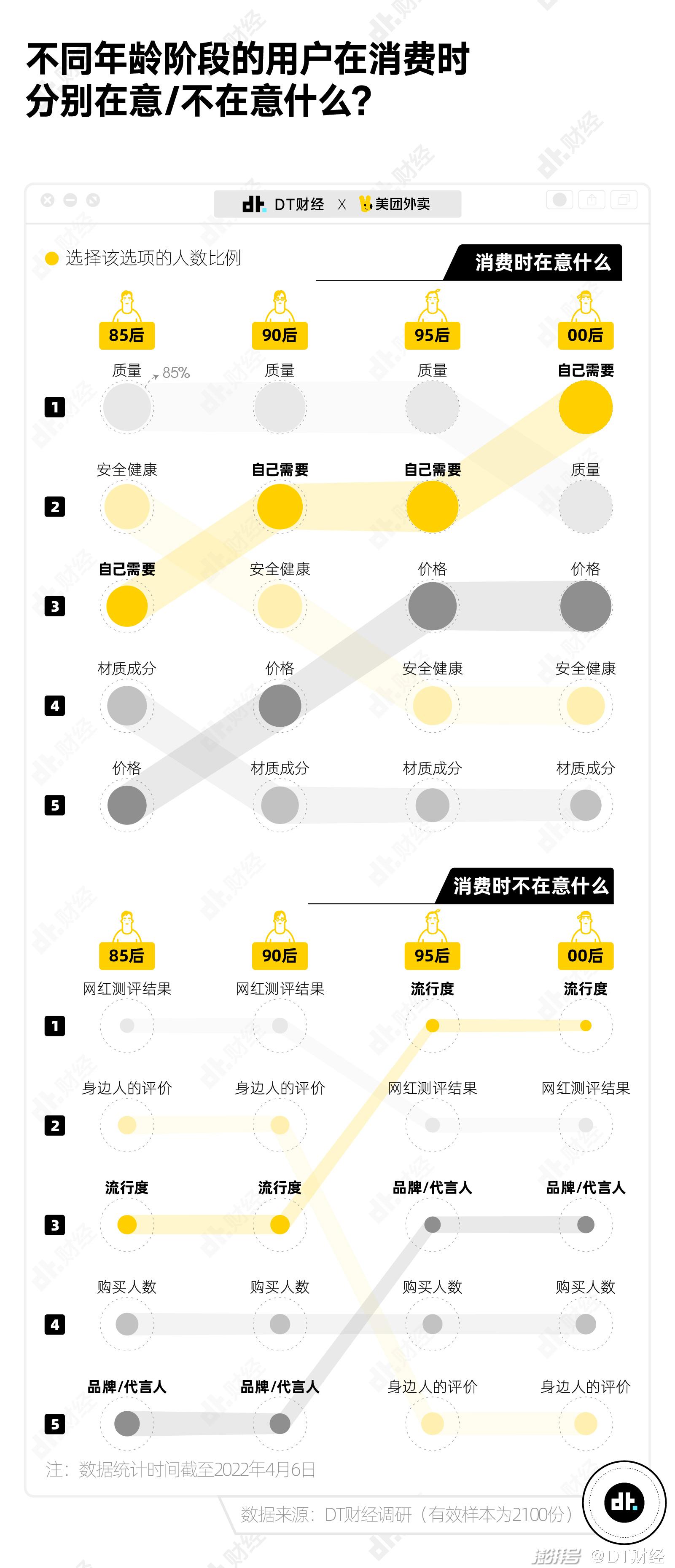 前段时间,我们联合美团外卖发起了当代青年消费调研,共有 2100 位朋友贡献了自己的答案。其中00后、95后和90后占比7 成(69.5%),所以你也可以认为,这是针对18-32岁青年的消费观察。