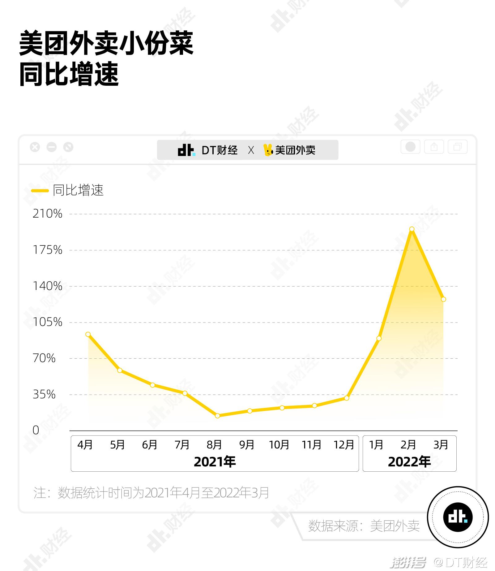 美团外卖的数据显示,从2021年4月至2022年3月,美团外卖“小份菜”的订单量逐月增加,今年2月和3月,同比增速分别达到了195%和127%(“小份菜”是指美团倡导外卖商家提供的小分量选项,为“一人食”“商务餐”的年轻人提供便捷)。