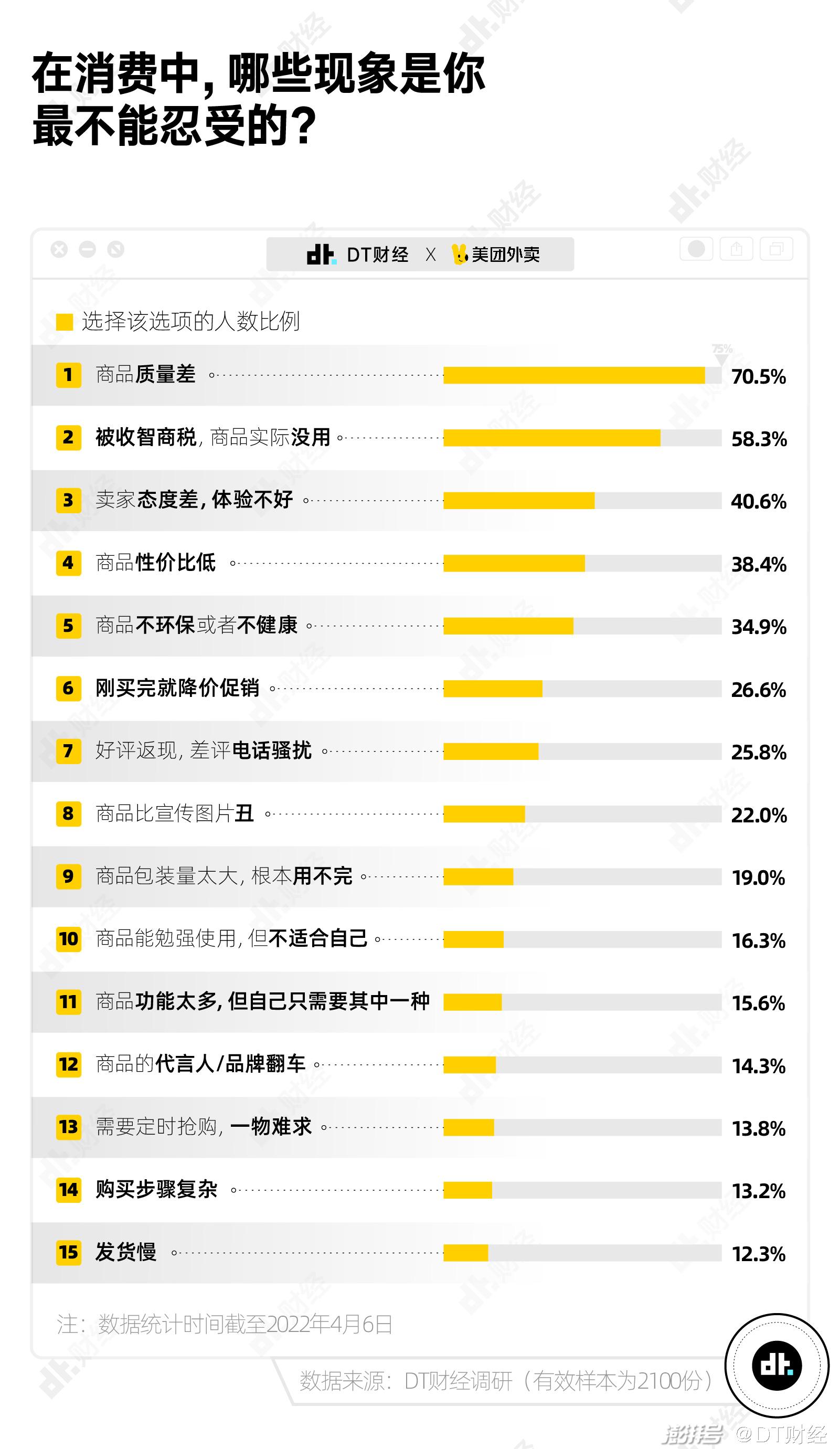 在消费过程中,他们不能忍受质量差(70.5%)和被收智商税(58.3%),也拒绝不健康或者不环保的商品(34.9%)——不能忍受这种现象的人数比例,甚至超过了“刚买完就降价促销”。