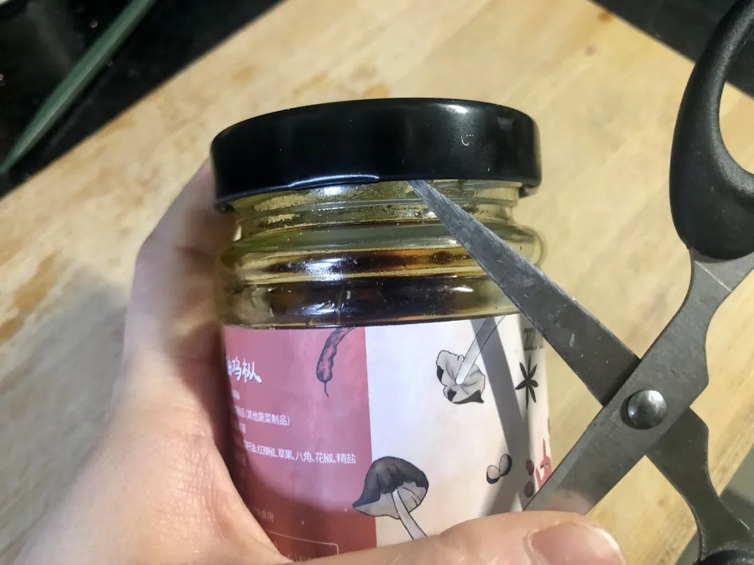 有没有注意到,每个罐头盖子的边缘,都有一小块儿凹下去的地方?拿出你的勺子、剪刀、水果刀,从凹陷处的边缘伸进盖子和瓶身的缝隙里,稍微用一点点力气,撬它!