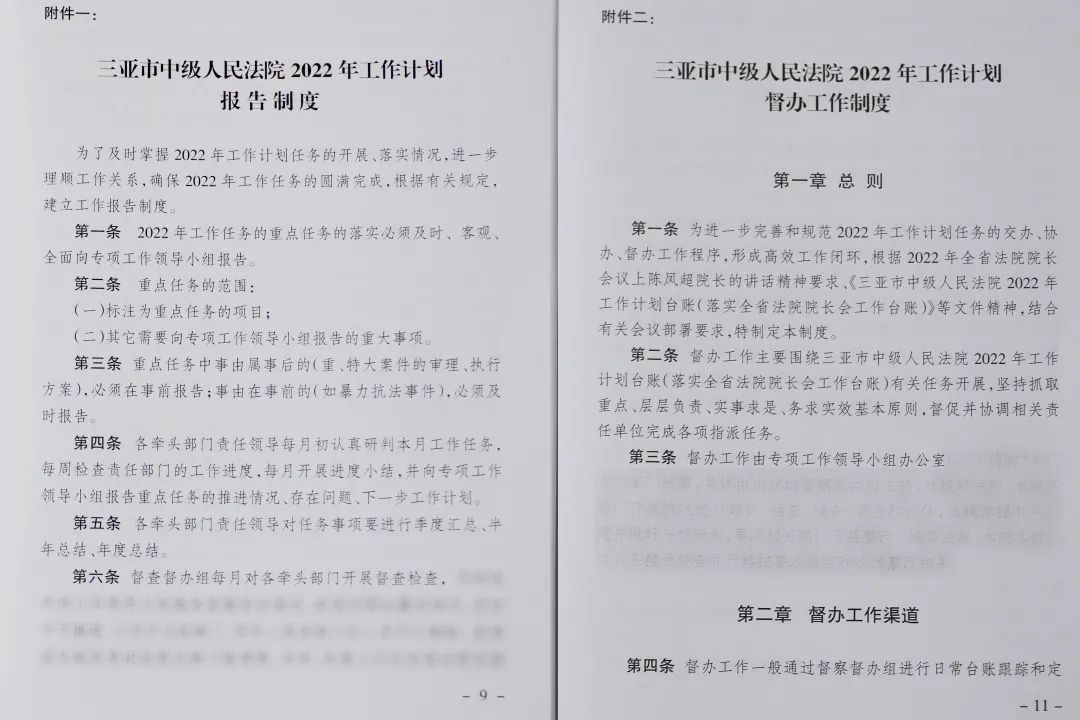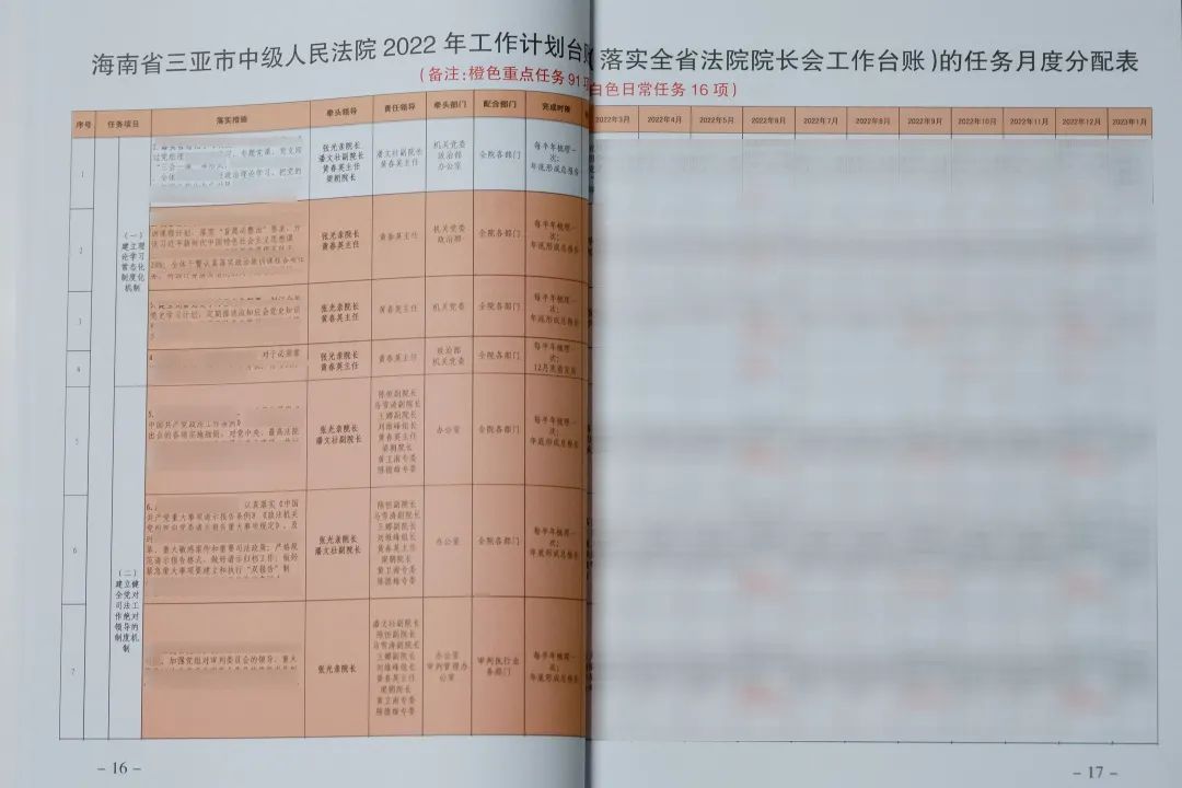 03细化工作内容,确定台帐管理事项。经院党组讨论确认,三亚中院2022年工作以“九个板块”107项任务的台账计划为全年工作中心,包括政治建设版块下设5部分20项、服务大局版块下设6部分22项、审判质效提升版块下设5部分16项、司法为民版块下设6部分16项、司法体制改革版块下设4部分11项、自贸港法院建设版块下设7部分7项、队伍建设版块下设3部分10项、司法公开版块下设2部分2项、基础建设版块下设3部分3项。同时确认十位院领导分别牵头负责的任务事项,对重点任务和日常任务通过橙色、白色的分色管理,并单独分割出各自牵头负责的分台账,要求每月第一周拟定当月工作计划;由院领导分别指定联络专员,由党组办公室牵头形成专项工作联络平台;牵头院领导召集分管部门多次召开专项工作会议研究具体推进计划,将任务清单内容明确到月、责任到人。自实行台帐式管理机制以来,院领导班子及其成员和部门负责人的责任意识明显提升,高标准、抓创新的工作积极性、主动性明显增强,有力地推进了三亚中院2022年工作计划目标任务的落实。