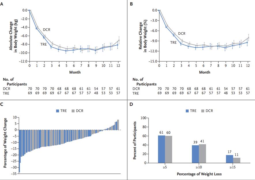 经过一年的饮食干预,限时饮食+热量限制组的参与者成功减重8kg(95%CI -9.6 to -6.4),单独热量限制组的体重也减轻6.3kg(95%CI -7.8 to -4.7)。