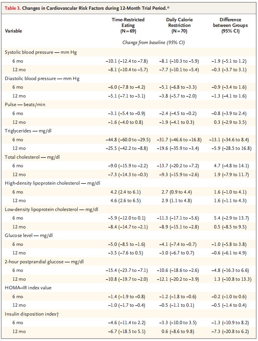 饮食干预12个月后,两组的空腹血糖、餐后2小时血糖水平、高密度脂蛋白胆固醇水平等降低,而且限时饮食没有显示出显著的额外收益。