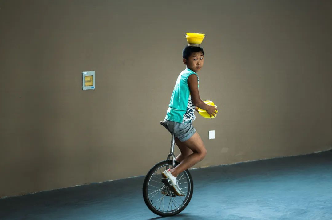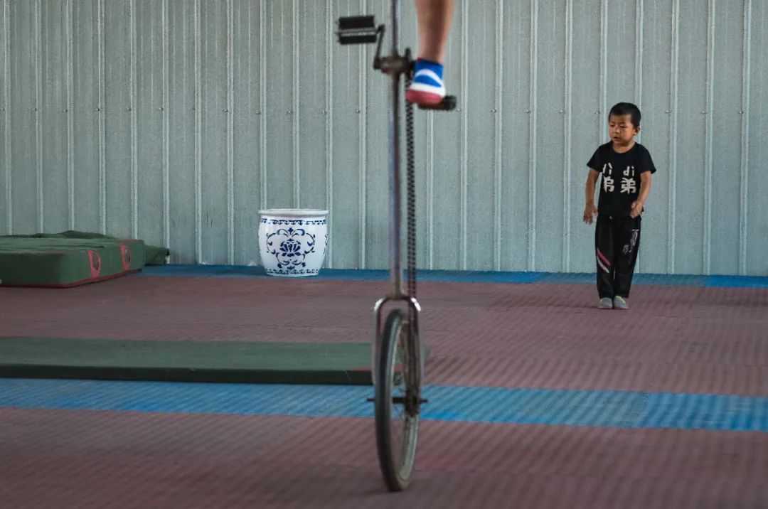 2017年6月9日,12岁的郭连帅独自在训练厅的一角练单车踢碗。