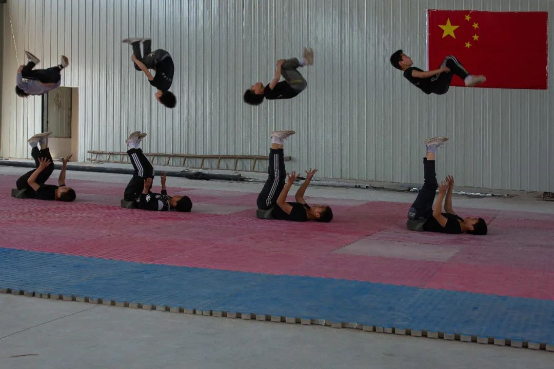 2017年4月29日,蹬人训练。集体动作的精准,靠的是孩子们之间心灵意念的默然一致。