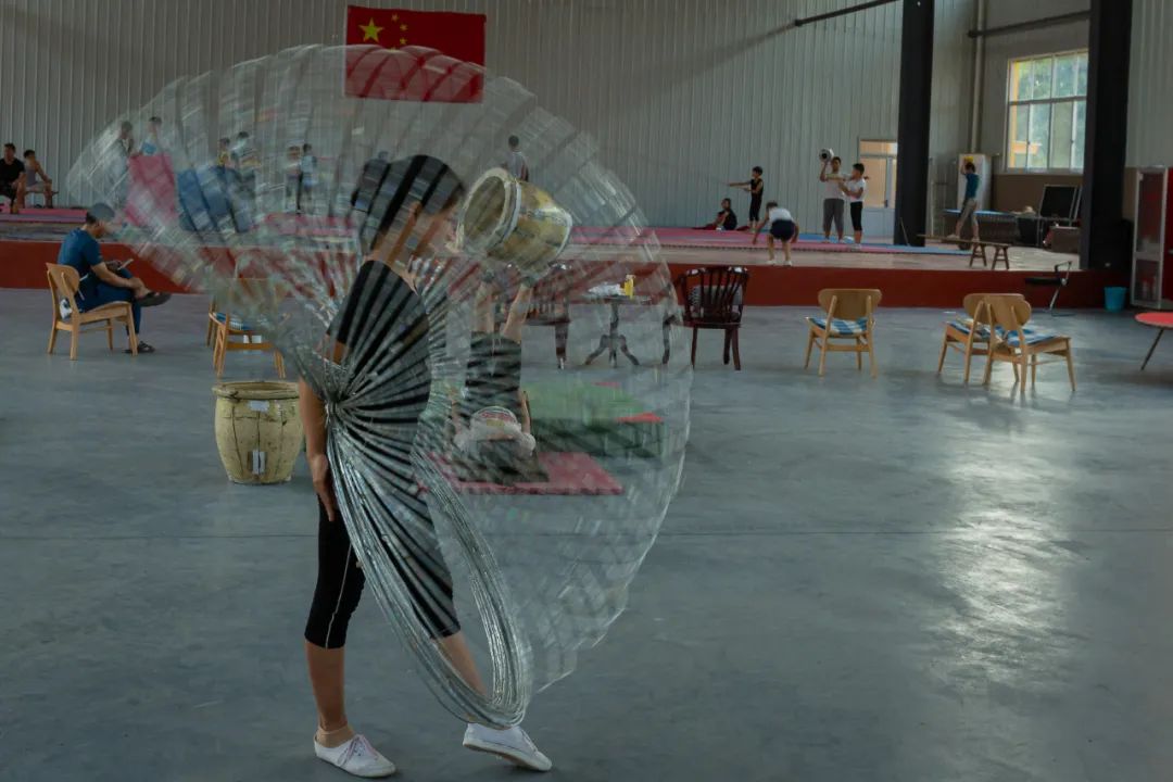 2017年6月27日,刘佳美的晃圈训练。一摞钢圈有7斤重,展开了像是孔雀开屏。