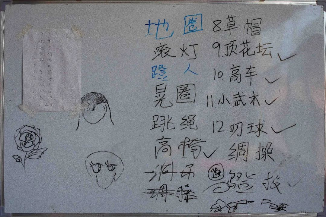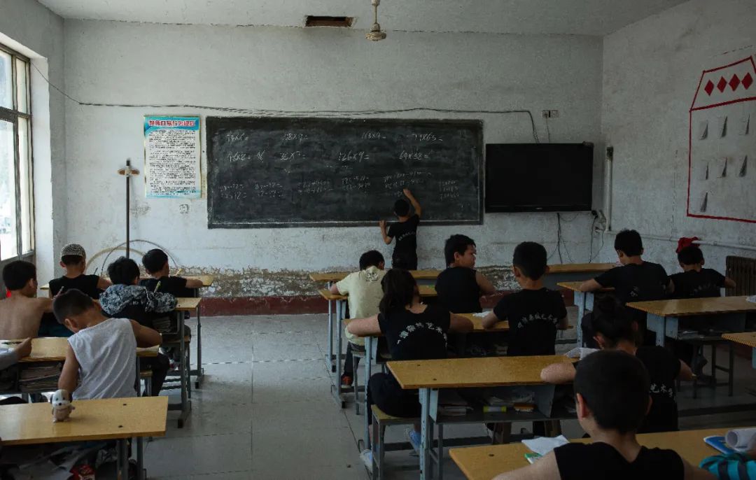 2017年4月29日,下午的文化课,值班生在黑板上写算术题。每天的上午8点、下午2点,孩子们都要坐在教室里上一个小时的文化课。