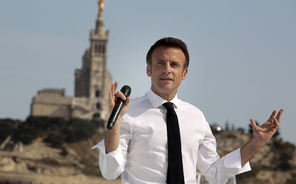 当地时间2022年4月16日,法国马赛,法国现任总统、2022法国总统大选共和国前进党候选人马克龙在南部城市马赛举行竞选集会。人民视觉 图