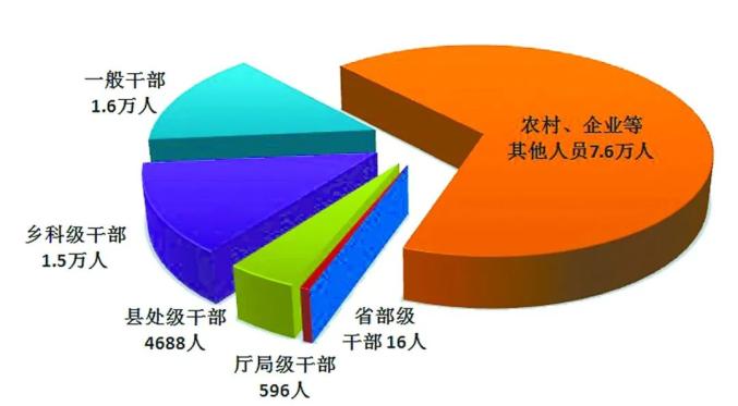 图2:全国纪检监察机关运用“四种形态”占比图2022年第一季度,全国纪检监察机关共接收信访举报85万件次,处置问题线索33.8万件,谈话函询6.6万件次,立案14.3万件,处分11.2万人(其中党纪处分9.3万人)。处分省部级干部16人,厅局级干部596人,县处级干部4688人,乡科级干部1.5万人,一般干部1.6万人,农村、企业等其他人员7.6万人。