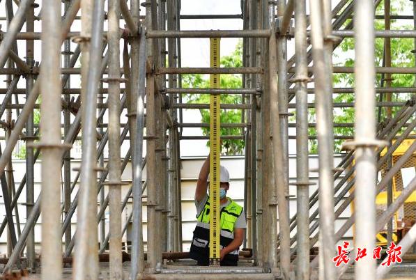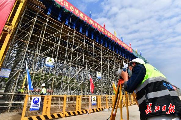 4月22日,武汉地铁5号线二期施工现场,监测人员在刚完成浇筑的首片简支梁下测量地面沉降数据。记者李永刚 摄“5号线二期为高架段,首片梁完成浇筑,标志着高架段正式开始梁体结构施工。梁体结构施工完成后,将进行铺轨等桥面施工。”武汉地铁集团建设事业总部业主代表刘彦超介绍,5号线二期工程从一期终点向南延伸,设科技大学站、红霞村站,线路长约2.63公里,均为高架线路。预计年内完成主体结构施工。