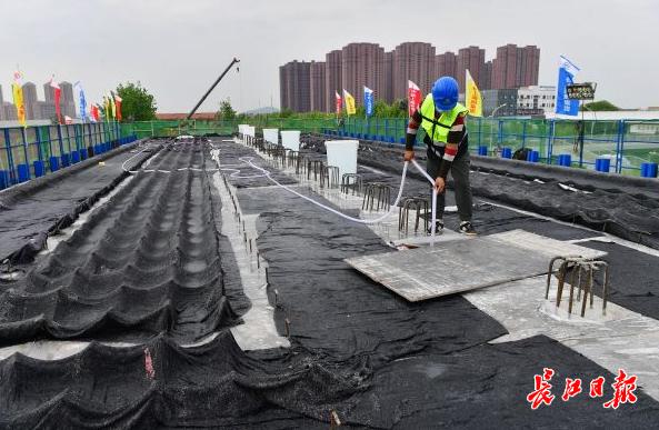 4月22日,武汉地铁5号线二期施工现场,施工人员正在对刚刚完成浇筑的首片简支梁进行养护。记者李永刚 摄