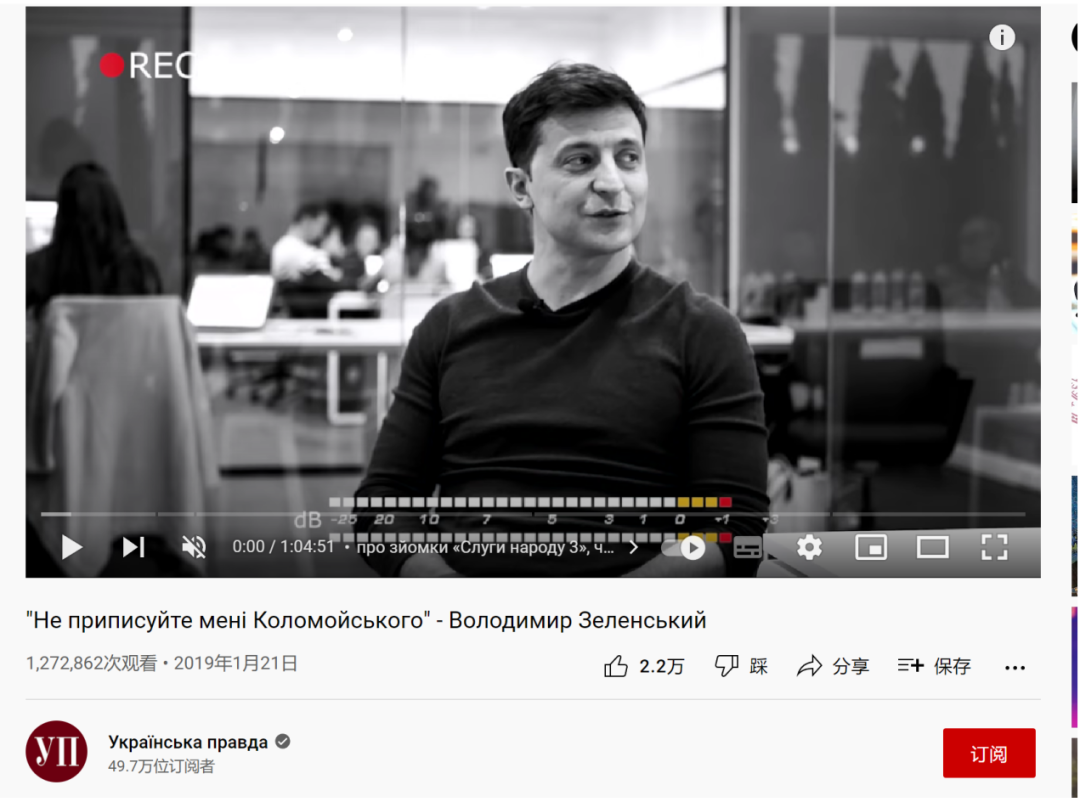 通过截取视频关键帧反搜发现,这条时长为23秒的视频来自于乌克兰《真理报》于2019年1月对泽连斯基进行的专访。《真理报》在其YouTube账号上发布了此次采访的完整视频,视频全长为1小时4分51秒。