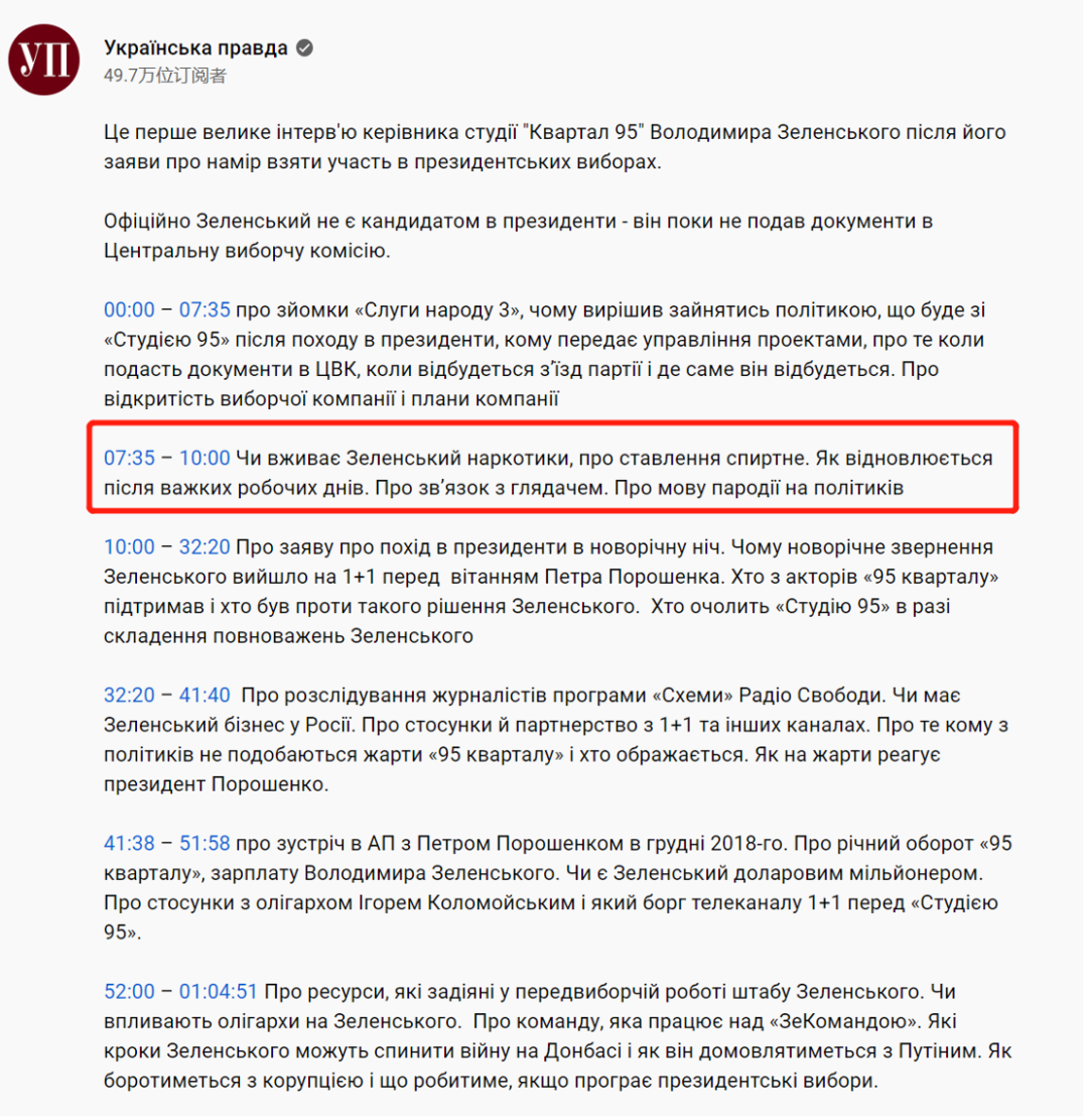 完整采访视频下方,《真理报》给出了视频内容的具体时间线,其中第7分35秒至第10分钟的内容为“泽连斯基是否吸毒,关于酒精的态度。劳累一天后如何恢复。关于观众交流。关于戏仿政客的语言”。