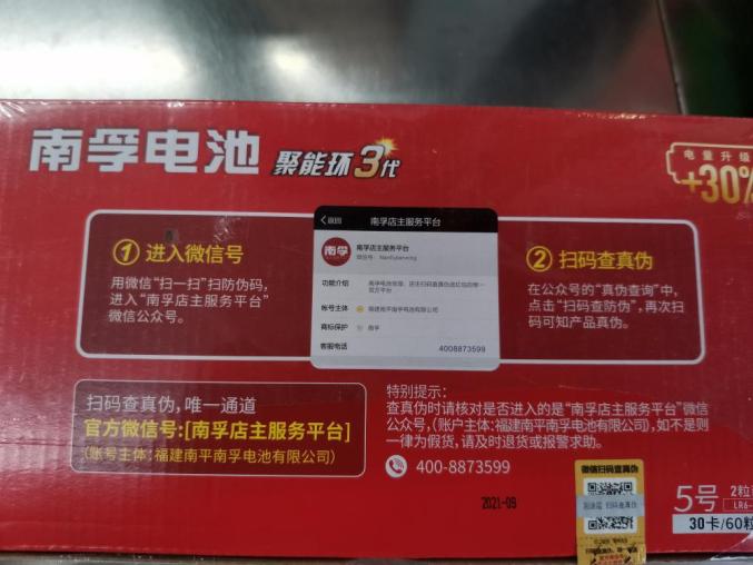 1.整盒包装时可刮开外包装上的二维码进行扫描,如果无法进入扫码查真伪唯一通道官方微信号:南孚店主服务平台,电池可能就是假的。