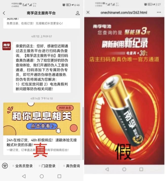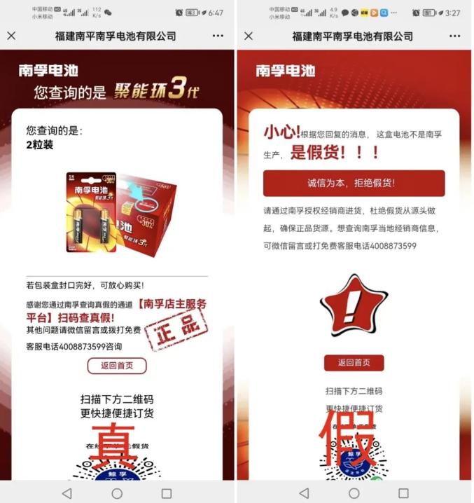 2.进入南孚店主服务平台后,点击右下角的真伪查询对外包装二维码进行二次扫描,在扫描结果页面选择电池的生产日期就能得到电池的真伪查询结果(此处南孚公司准备了小彩蛋)。原标题:《立案调查丨真假难辨!我市一地查获一批假冒产品》