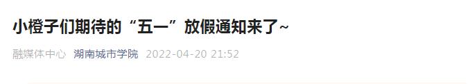 4月21日,湖南师范大学发布《关于2022年五一节放假安排的通知》,提到:4月30日(周六)至5月2日(周一)放假,共3天,4月24日(周日)和5月7日(周六)正常休息。附中、附小放假安排按照属地教育主管部门有关政策执行,幼儿园放假安排与大学保持同步。