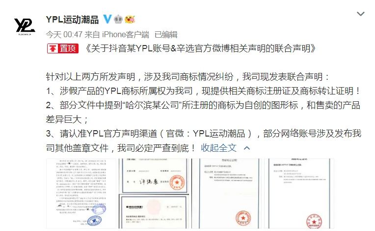 4月23日凌晨,就辛选官方微博声明,@YPL运动潮品再发声明表示,部分文件中提到“哈尔滨某公司”所注册的商标为自创的图形标,和售卖的产品差异巨大;部分网络账号涉及发布我司其他盖章文件,必定严查到底!