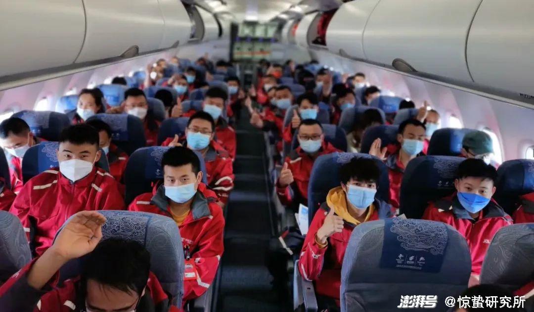 *援沪快递员们在飞机上的合影,受访者提供