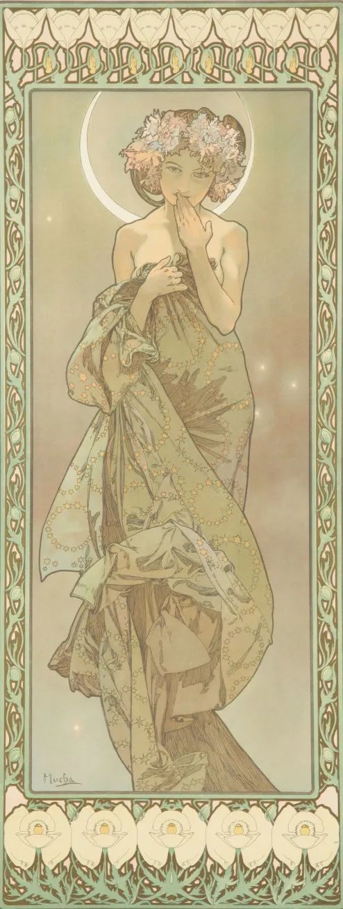 穆夏的视觉盛宴1894年底,于巴黎沉寂已久的穆夏得到了为当红巨星莎拉·伯恩哈特设计海报的机会,而正是他背后的《吉斯蒙达》,令“穆夏”这个名字在一夜之间响彻了整个巴黎。