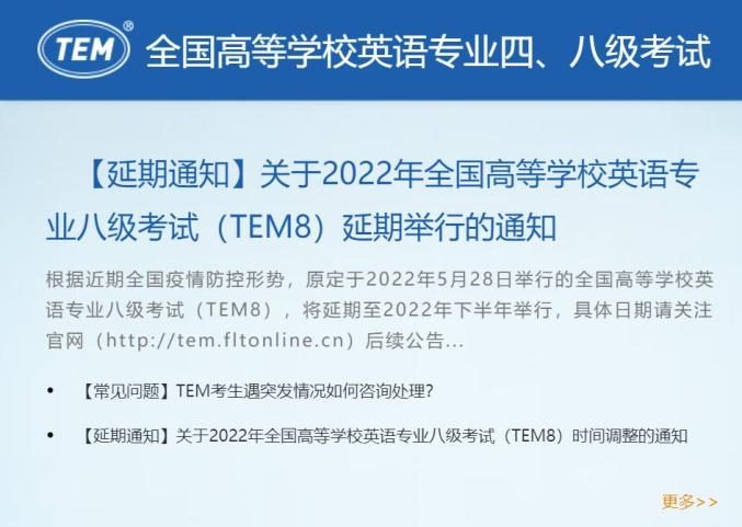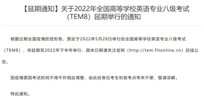 关于2022年全国高等学校英语专业八级考试(TEM8)延期举行的通知根据近期全国疫情防控形势,原定于2022年5月28日举行的全国高等学校英语专业八级考试(TEM8),将延期至2022年下半年举行,具体日期请关注官网(http://tem.fltonline.cn)后续公告。