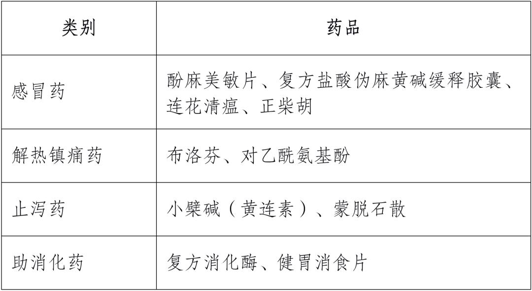 包括针对头痛、发烧、腹泻、消化不良的药物,要注意选择较安全、用法简单的药物,并且尽量做到少而精,详细可见下表: