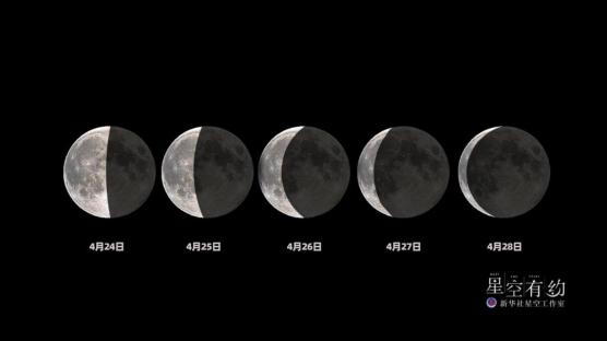 这是4月24日至28日的月相变化。(制作:胡彦竹)修立鹏提醒说,感兴趣的公众要想目睹“四星连珠伴月”,一定要早起,最佳时间在日出前30分钟至60分钟,观测时要选择东南方空旷、视野开阔、无光污染的场地,如郊区、高山,凭借肉眼即可欣赏。其间,早起的朋友还可以观测到淡淡的、呈拱桥形状的银河。难得的是,一些地方(如北京)的公众还会看到中国空间站与“四星连珠伴月”短暂“邂逅”的罕见画面。而如果是在城市里观测,受晨光和灯光等影响,可能只会看到金星和木星上演的“双星伴月”,但也很精彩。